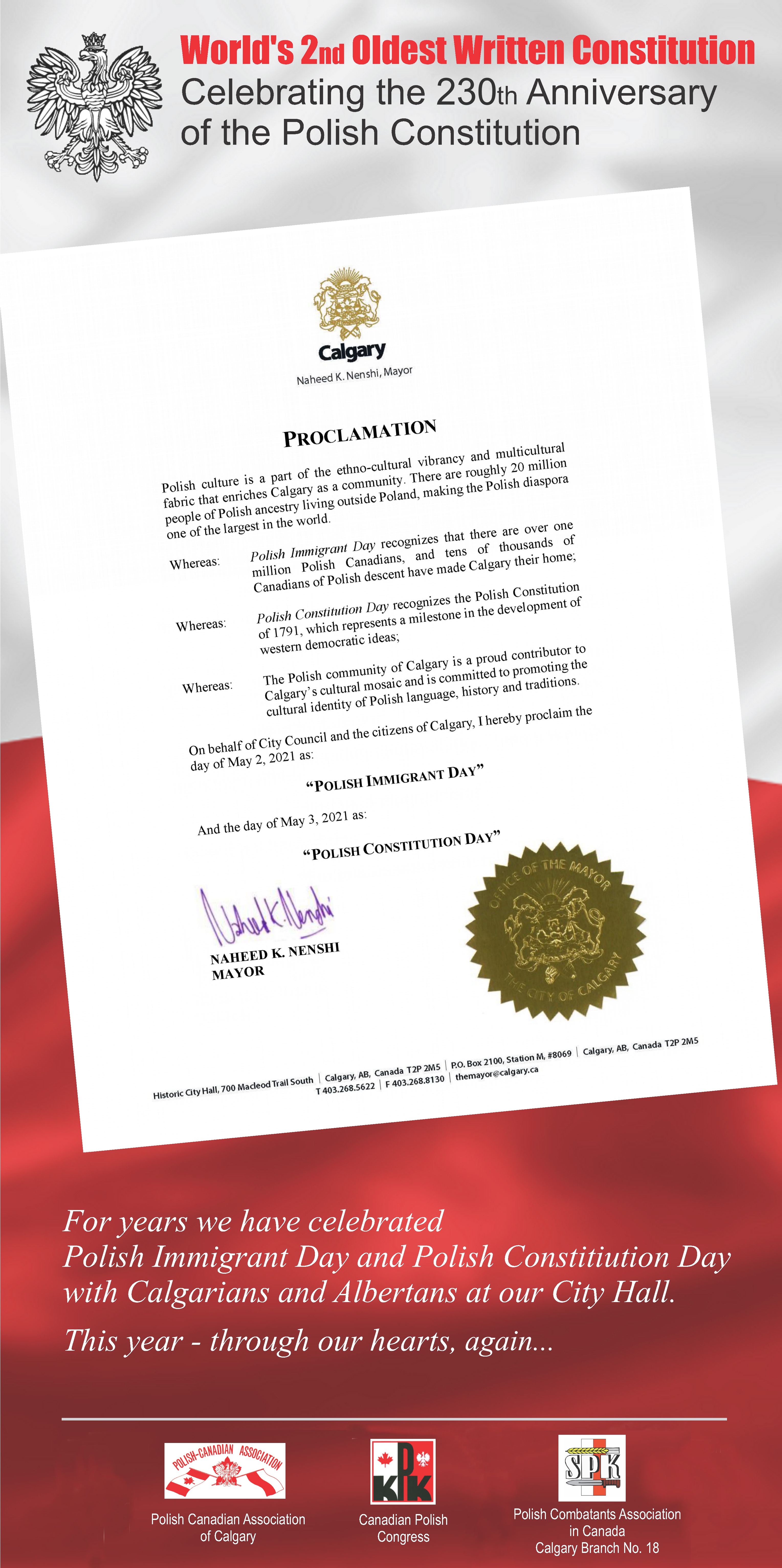 w poniedziałek, 3 maja 2021, dokładnie w 230 rocznicę uchwalenia Konstytucji 3 Maja, z inicjatywy PCA we współpracy z SPK#18, w lokalnych gazetach Calgary ukaże się proklamacja burmistrza miasta Calgary (poniżej), ogłaszająca dzień 2 maja /dniem Polskiego Emigranta, a dzień 3 maja Dniem Polskiej konstytucji. Przypominamy, że z uwagi na obowiązujący zakaz publicznych zgromadzeń nie będziemy mogli – jak do tej pory – zebrać się przed budynkiem miejskiego ratusza aby być świadkami uroczystości wciągnięcia polskiej flagi na maszt.
