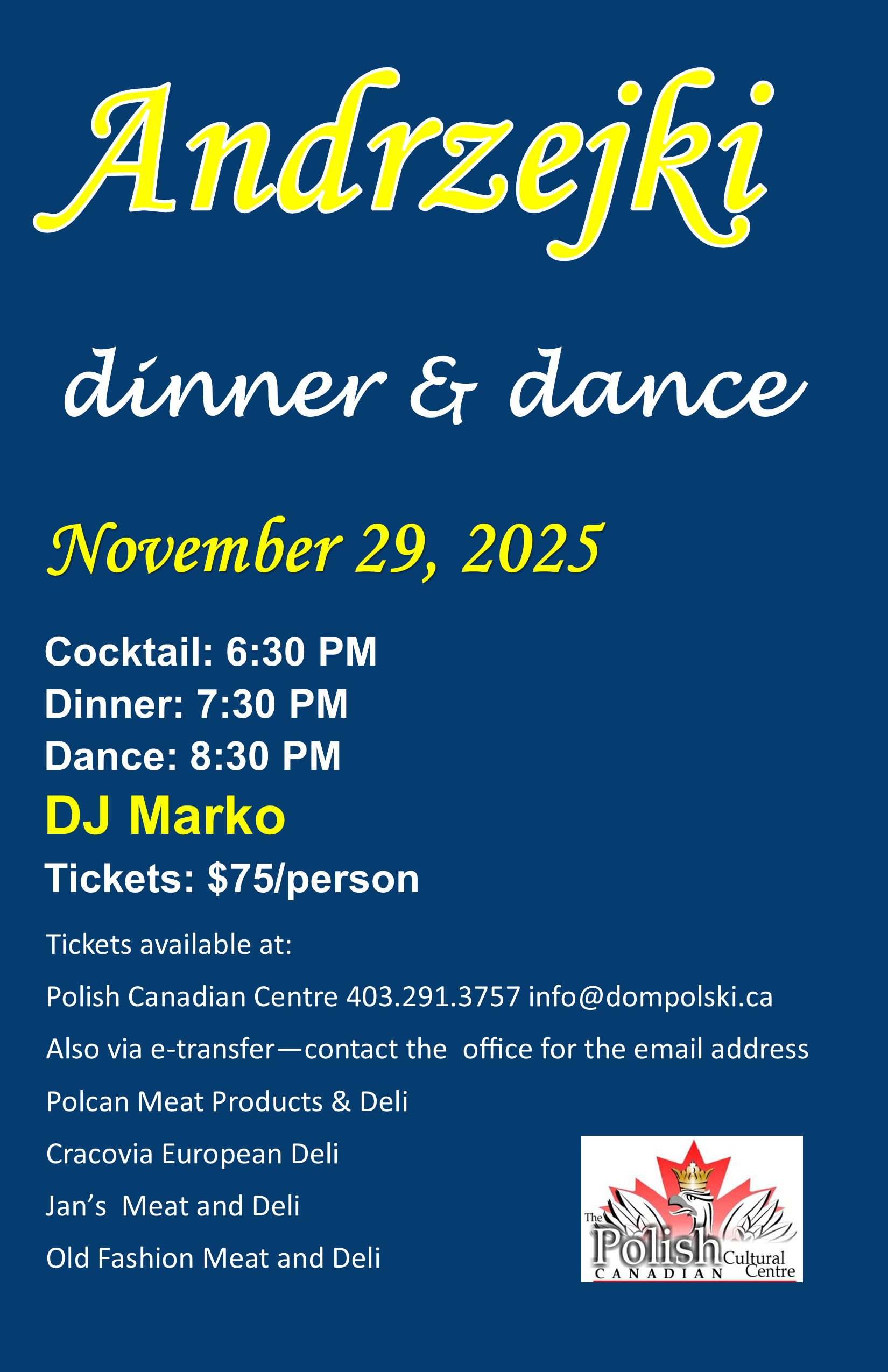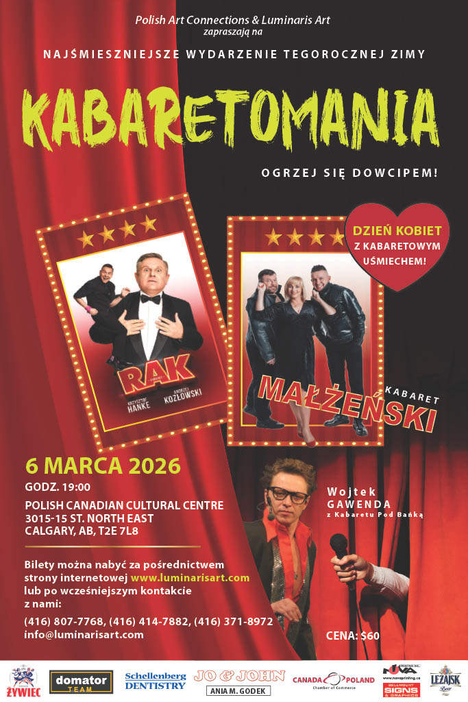 W piątek 6 marca 2026 o godzinie 19:00 w Domu Polskim wystąpią polskie kabarety: Rak i Kabaret Małżeński. Organizatorem występu jest Polish Art Connection & Luminaris Art. Bilety w cenie CAD 60.00 można nabyć dzwoniąc pod numery podane na plakacie poniżej lub na numer Domu Polskiego (403) 291-3757.