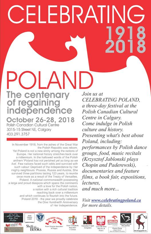 Stowarzyszenie Polskich Kombatantów Koło nr 18 w Calgary orazStowarzyszenie Polsko-Kanadyjskie w Calgary zaprasza wszystkich członków,harcerzy i ich rodziny, członków organizacji oraz społeczność polonijną na Mszę Św. do Kościoła MBKP z okazji obchodów 100 lecia Niepodległości Polski w niedzielę 11 listopada 2018 r. o godz. 12.30 w południe. Bezpośrednio po Mszy Św. o godz. 14.30 (2.30 pm) zapraszamy do Domu Polskiego na Akademię z tej okazji.