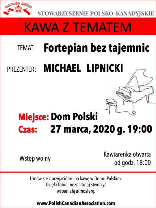 Kolejne spotkanie z cyklu “Kawa z Tematem” odbędzie się 27 marca 2020 o godzinie 19:00. Nasz gość – Michael Lipnicki – jeden z najbardziej uznanych w Ameryce Północnej stroicieli fortepianów, opowie o roli stroiciela w przygotowaniu instrumentu do koncertu a także o swoich przygodach związanych tym najbardziej popularnym, obok skrzypiec, instrumentem. Usłyszymy też wiele zabawnych anegdot o znanych artystach, z którymi Michael współpracował w przeszłości i nadal pracuje.