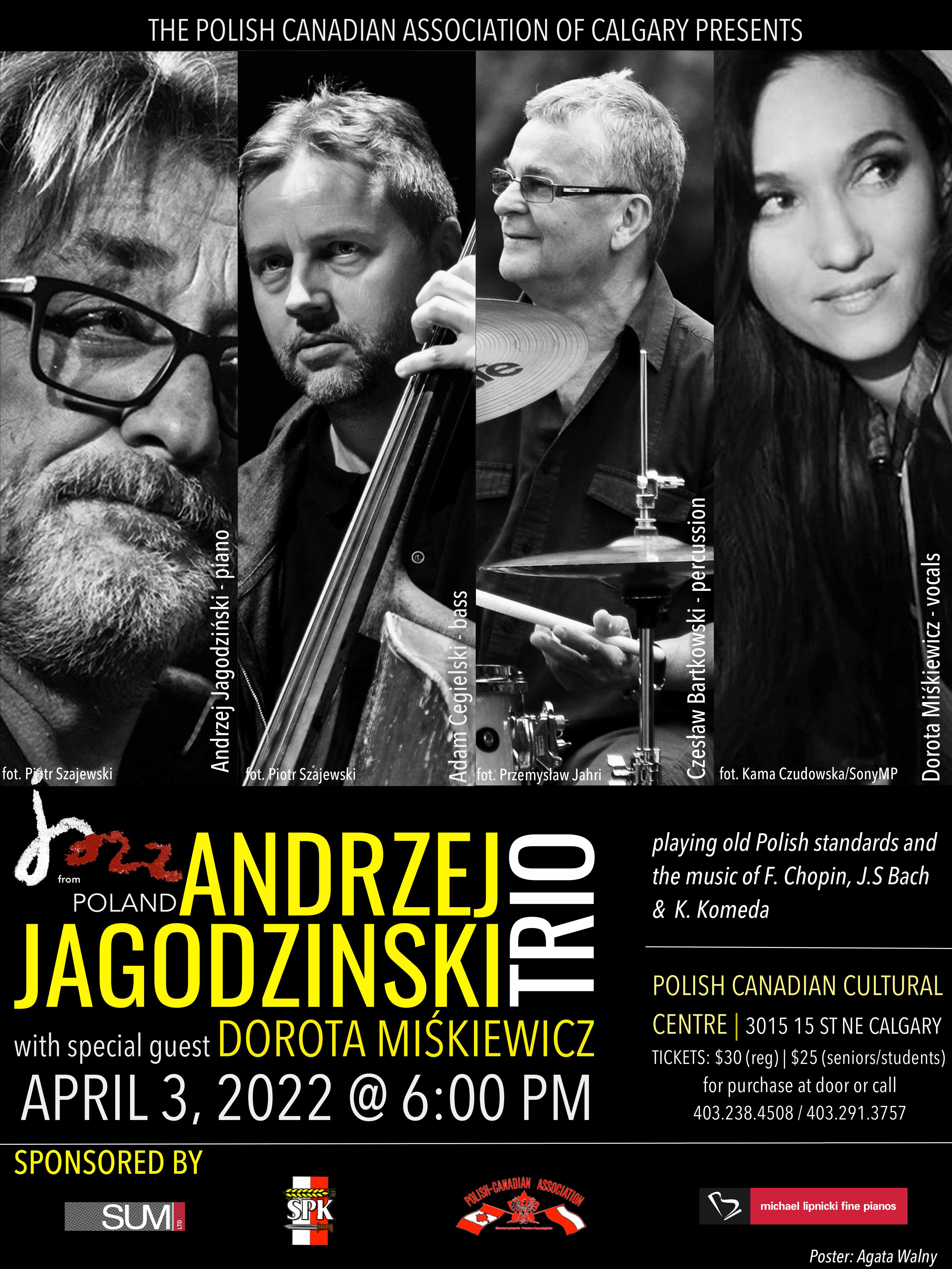 Po dwóch latach przerwy spowodowanej pandemią, Stowarzyszenie Polsko Kanadyjskie w Calgary ma przyjemność zaprosić miłośników dobrej muzyki na wyjątkowy koncert.W niedzielę 3-go kwietnia o godzinie 18:00 w Domu Polskim wystąpi Trio Andrzeja Jagodzińskiego w składzie: AndrzejJagodziński (fortepian), Czesław Bartkowski (perkusja), Adam Cegielski (kontrabas). Jako gość specjalny wystąpi czołowa polska wokalistka jazzowa Dorota Miśkiewicz.