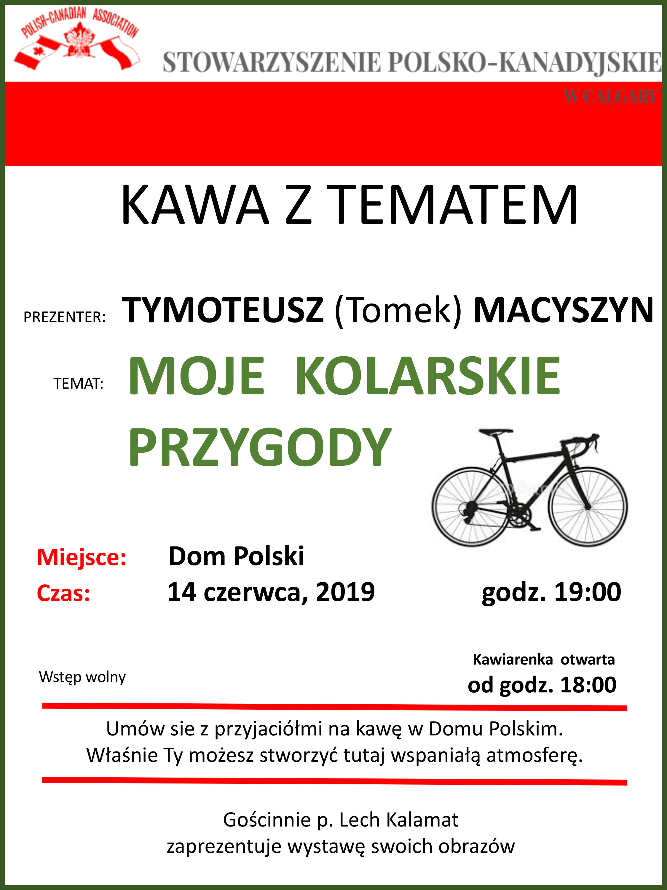 Stowarzyszenie Polsko-Kanadyjskie zaprasza na kolejną ‘Kawę z Tematem’. Tym razem nasz (mieszkający od lat w Calgary) mistrz kolarski, były członek Kadry Narodowej, pan Tymoteusz (zwany Tomkiem) Macyszyn opowie o swoich kolarskich przygodach. A miał ich mnóstwo. Przez lata mieszkał we Wrocławiu i tam należał do klubu kolarskiego ‘Dolmel’. Jakie były początki przygód p. Tomka z rowerem, gdzie startował, gdzie zwyciężał, gdzie przegrywał, z kim się ścigał ( a trzeba wiedzieć, że konkurentem na trasie, ale także bliskim przyjacielem Tomka był m.in. znany wszystkim Ryszard Szurkowski)… wszystkiego będzie można się dowiedzieć w piątek, 14 czerwca w Domu Polskim. Ponadto p. Tomek opowie jak ‘pielęgnować’ rower, żeby służył jak najdłużej … Zapraszamy nie tylko miłośników ‘szaleństwa’ rowerowego, ale także tych wszystkich, którzy chcą poznawać ciekawych ludzi.